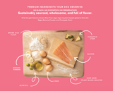 • Ingredients: Wild-caught Salmon, Brown Rice Flour, Agar-Agar (a plant-based gelatin), Olive Oil, Eggs, Banana Powder, Pineapple Stem.