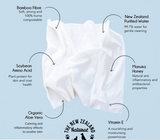 Ingredients: 100% Sustainable Bamboo Fibre, Purified New Zealand Water, Manuka Honey, Natural Soybean Amino Acid, Aloe vera, Vitamin E.